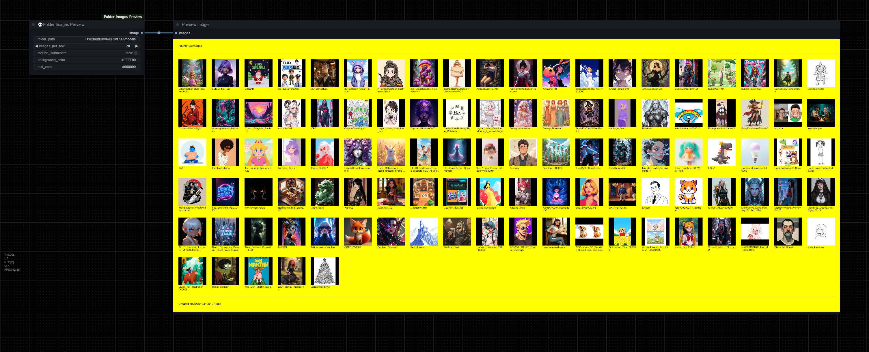 After upgrading Custom-scripts, the LoRA loader has not been displaying preview images of LoRA models. So, I wrote this node, which can quickly preview images and their filenames in a specific folder. Although it’s not as convenient as the one in Custom-scripts, it still helps me quickly reference LoRA preview images.